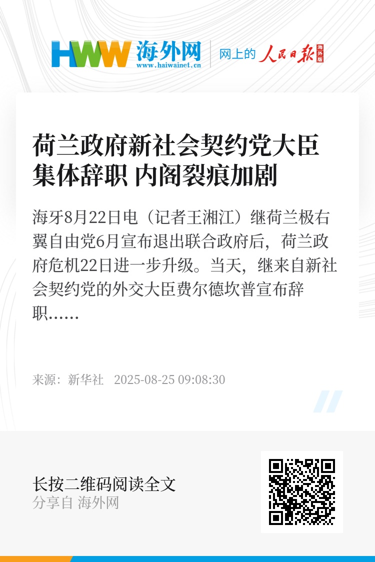 新社会契约党全体大臣辞职令本已脆弱的荷兰联合政府再添不确定性。在自由党今年6月3日因难民庇护政策问题退出执政联盟后,内阁已处于看守状态。荷兰众议院选举将于10月29日举行。