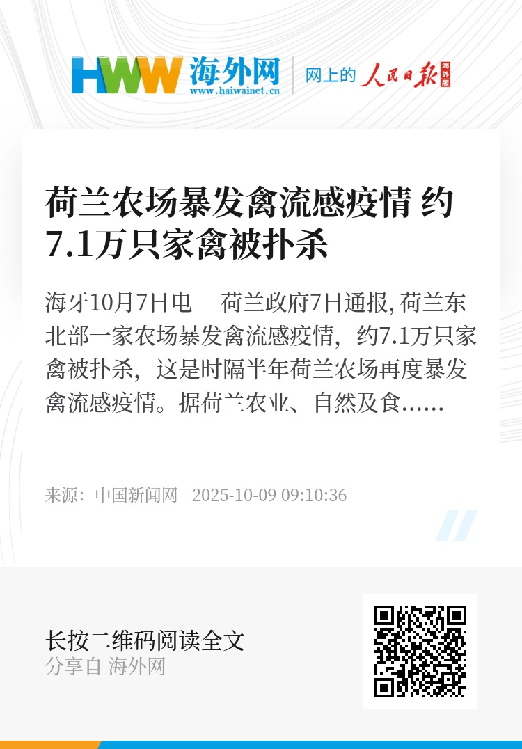 据荷兰农业、自然及食品质量部当日发布的公告,涉事农场位于荷兰东北部德伦特省阿恩亨泽市(Aa en Hunze)。为遏制疫情蔓延,当局正在扑杀农场约7.1万只家禽。