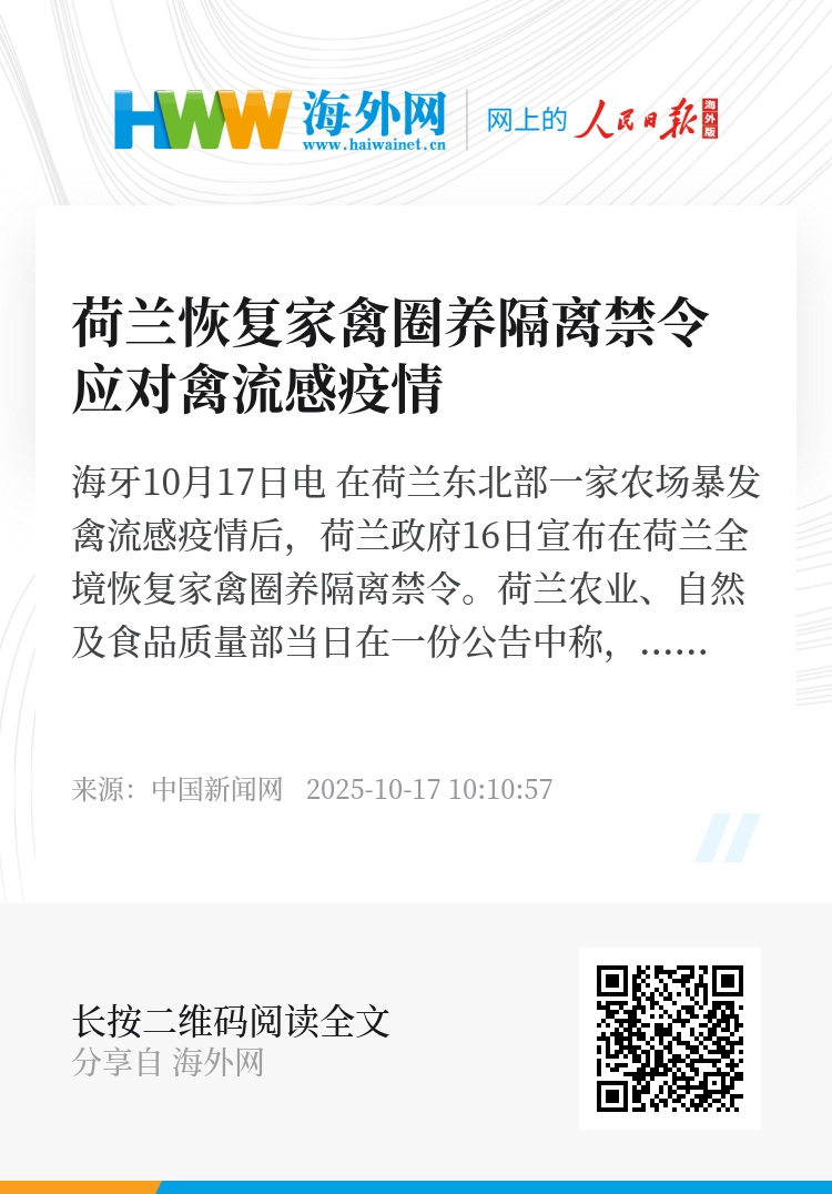中新网海牙10月17日电 在荷兰东北部一家农场暴发禽流感疫情后,荷兰政府16日宣布在荷兰全境恢复家禽圈养隔离禁令。