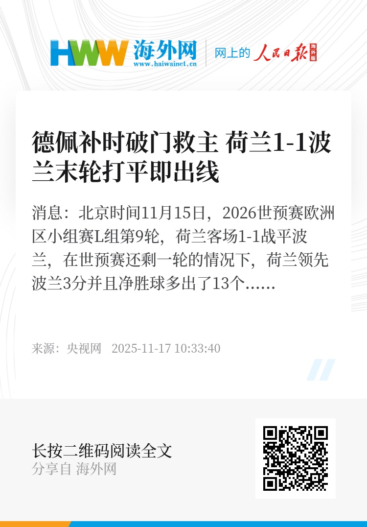 央视网消息:北京时间11月15日,2026世预赛欧洲区小组赛L组第9轮,荷兰客场1-1战平波兰,在世预赛还剩一轮的情况下,荷兰领先波兰3分并且净胜球多出了13个。