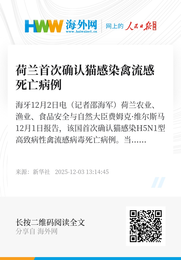 新华社海牙12月2日电(记者邵海军)荷兰农业、渔业、食品安全与自然大臣费姆克·维尔斯马12月1日报告,该国首次确认猫感染H5N1型高致病性禽流感病毒死亡病例。