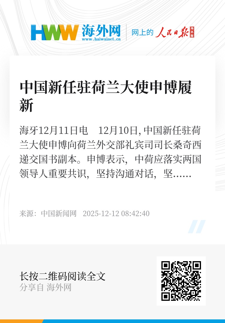 申博表示,中荷应落实两国领导人重要共识,坚持沟通对话,坚持互利共赢,推动两国开放务实的全面合作伙伴关系不断发展。作为新任驻荷兰大使,将为此作出不懈努力。