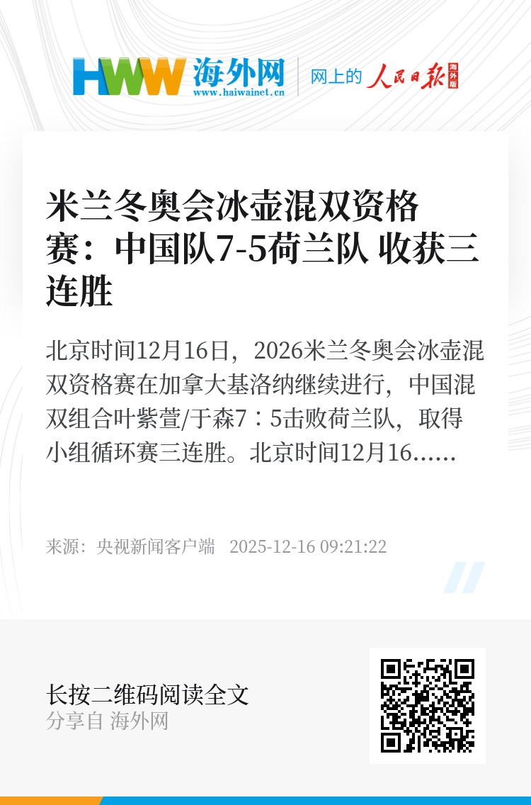 北京时间12月16日,2026米兰冬奥会冰壶混双资格赛在加拿大基洛纳继续进行,中国混双组合叶紫萱/于森7∶5击败荷兰队,取得小组循环赛三连胜。