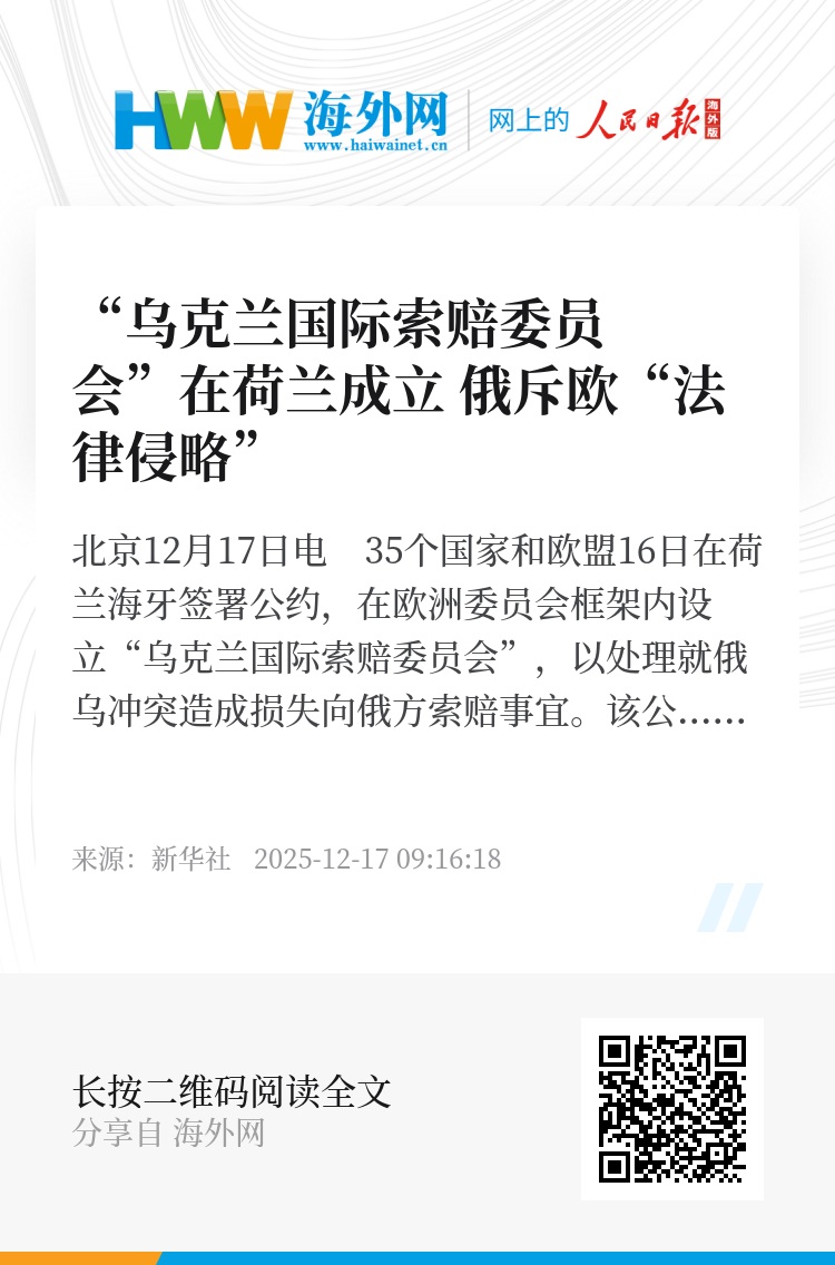 新华社北京12月17日电 35个国家和欧盟16日在荷兰海牙签署公约,在欧洲委员会框架内设立“乌克兰国际索赔委员会”,以处理就俄乌冲突造成损失向俄方索赔事宜。