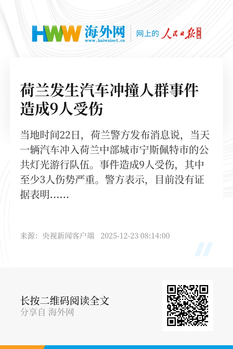 当地时间22日,荷兰警方发布消息说,当天一辆汽车冲入荷兰中部城市宁斯佩特市的公共灯光游行队伍。事件造成9人受伤,其中至少3人伤势严重。