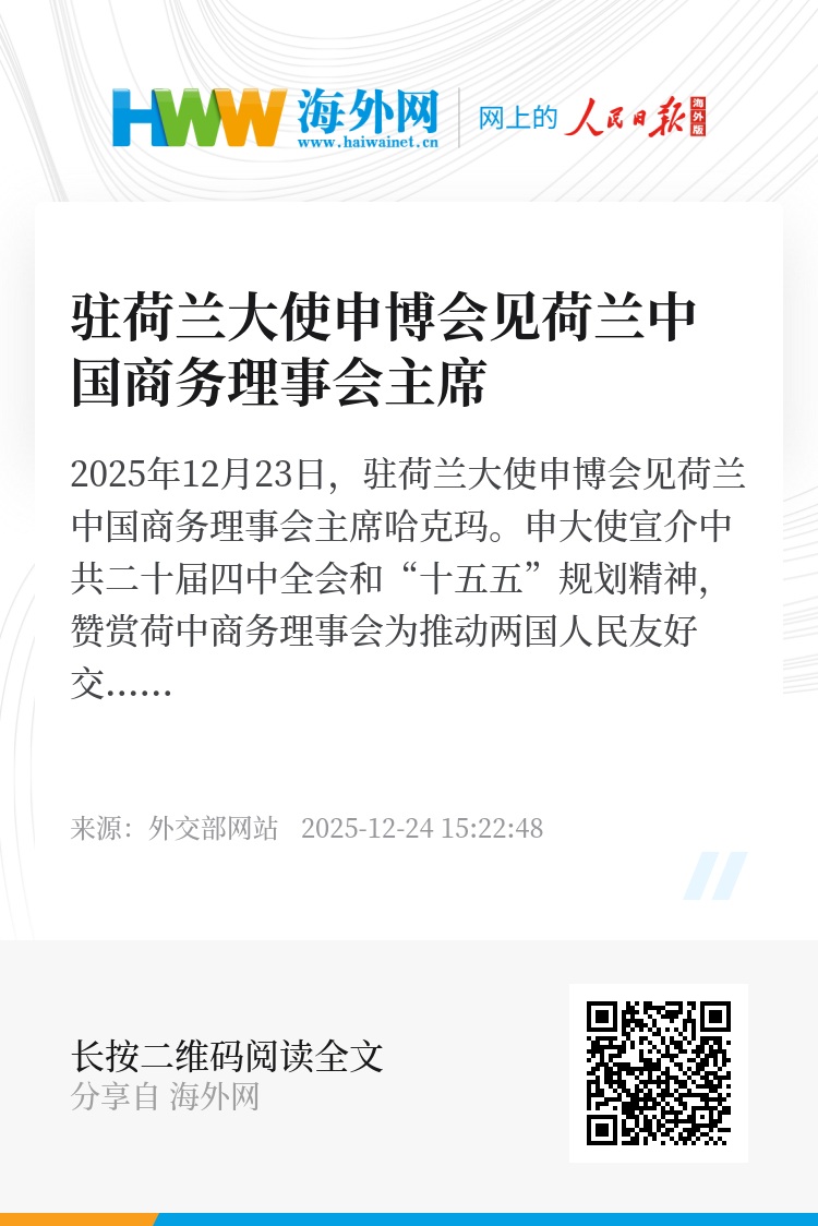 2025年12月23日,驻荷兰大使申博会见荷兰中国商务理事会主席哈克玛。申大使宣介中共二十届四中全会和“十五五”规划精神,赞赏荷中商务理事会为推动两国人民友好交往、促进中荷经贸合作等作出的重要贡献,希望理事会继续发挥积极和建设性作用。哈克玛介绍了理事会发展情况,表示愿为增进荷中互利合作继续作出贡献。