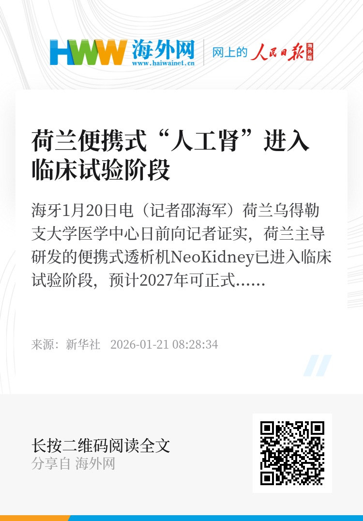 新华社海牙1月20日电(记者邵海军)荷兰乌得勒支大学医学中心日前向记者证实,荷兰主导研发的便携式透析机NeoKidney已进入临床试验阶段,预计2027年可正式上市。