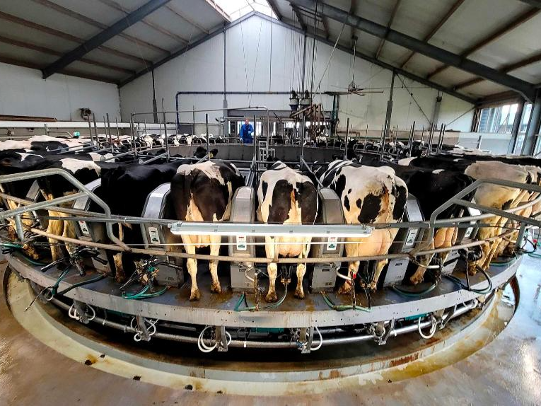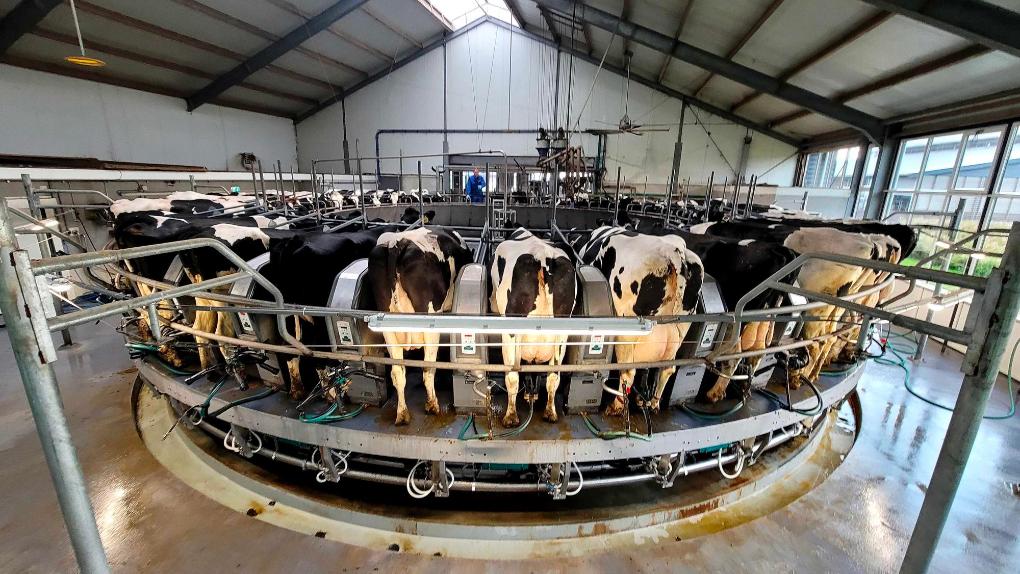 2025年9月30日,在荷兰吕伐登的瓦赫宁根大学及研究中心乳业园,奶牛站在自动化挤奶转盘上。新华社记者王湘江摄