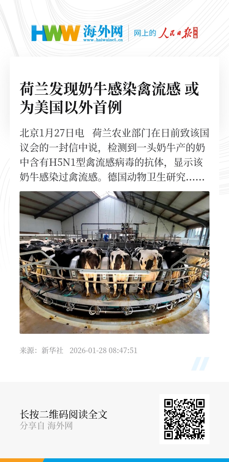 新华社北京1月27日电 荷兰农业部门在日前致该国议会的一封信中说,检测到一头奶牛产的奶中含有H5N1型禽流感病毒的抗体,显示该奶牛感染过禽流感。德国动物卫生研究机构弗里德里希·洛夫勒研究所26日说,依据其掌握的信息,这是首次在美国以外地区发现奶牛感染禽流感。