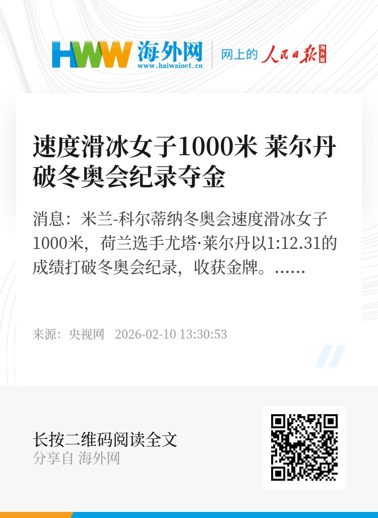 央视网消息:米兰-科尔蒂纳冬奥会速度滑冰女子1000米,荷兰选手尤塔·莱尔丹以1:12.31的成绩打破冬奥会纪录,收获金牌。