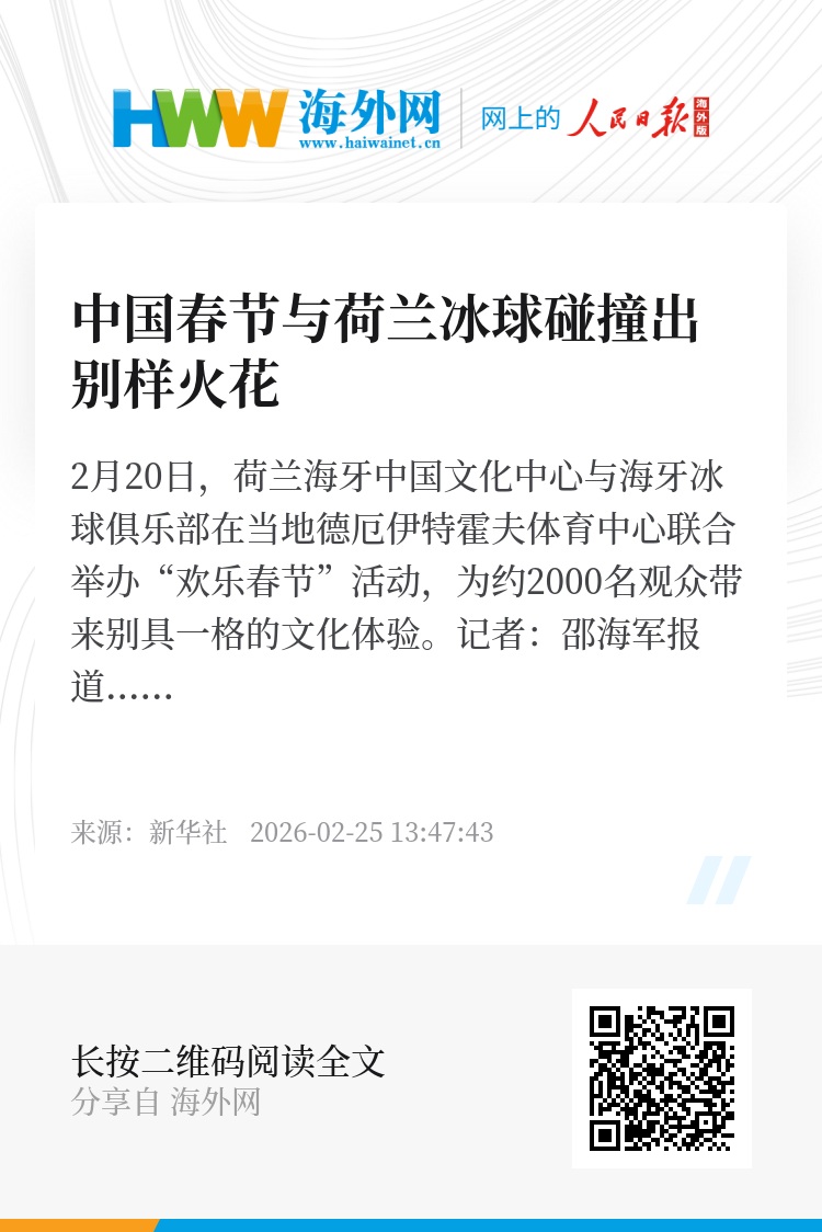 2月20日,荷兰海牙中国文化中心与海牙冰球俱乐部在当地德厄伊特霍夫体育中心联合举办“欢乐春节”活动,为约2000名观众带来别具一格的文化体验。