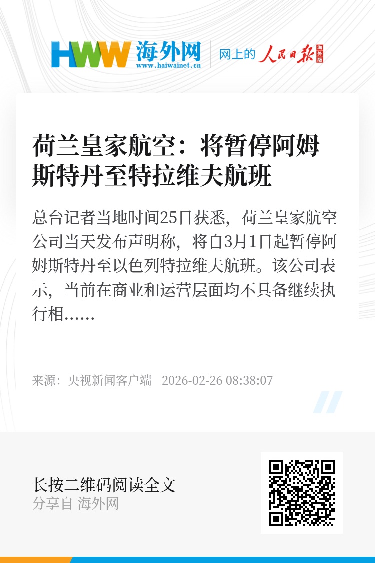总台记者当地时间25日获悉,荷兰皇家航空公司当天发布声明称,将自3月1日起暂停阿姆斯特丹至以色列特拉维夫航班。该公司表示,当前在商业和运营层面均不具备继续执行相关航班的条件。
