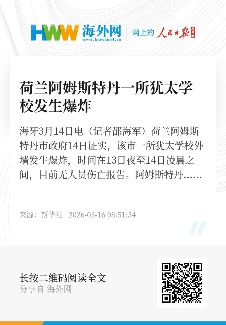 新华社海牙3月14日电(记者邵海军)荷兰阿姆斯特丹市政府14日证实,该市一所犹太学校外墙发生爆炸,时间在13日夜至14日凌晨之间,目前无人员伤亡报告。