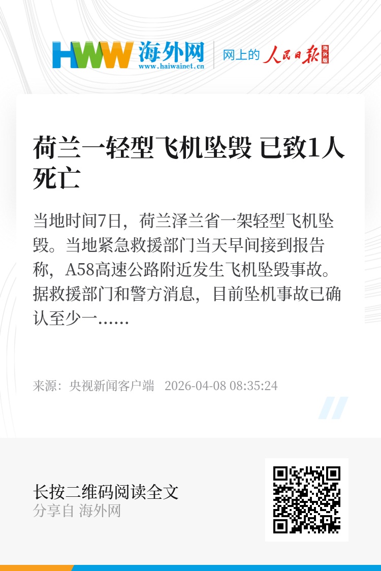 当地时间7日,荷兰泽兰省一架轻型飞机坠毁。当地紧急救援部门当天早间接到报告称,A58高速公路附近发生飞机坠毁事故。