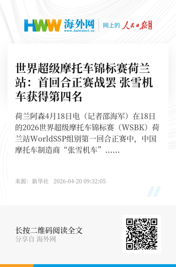 新华社荷兰阿森4月18日电(记者邵海军)在18日的2026世界超级摩托车锦标赛(WSBK)荷兰站WorldSSP组别第一回合正赛中,中国摩托车制造商“张雪机车”获得第四名。